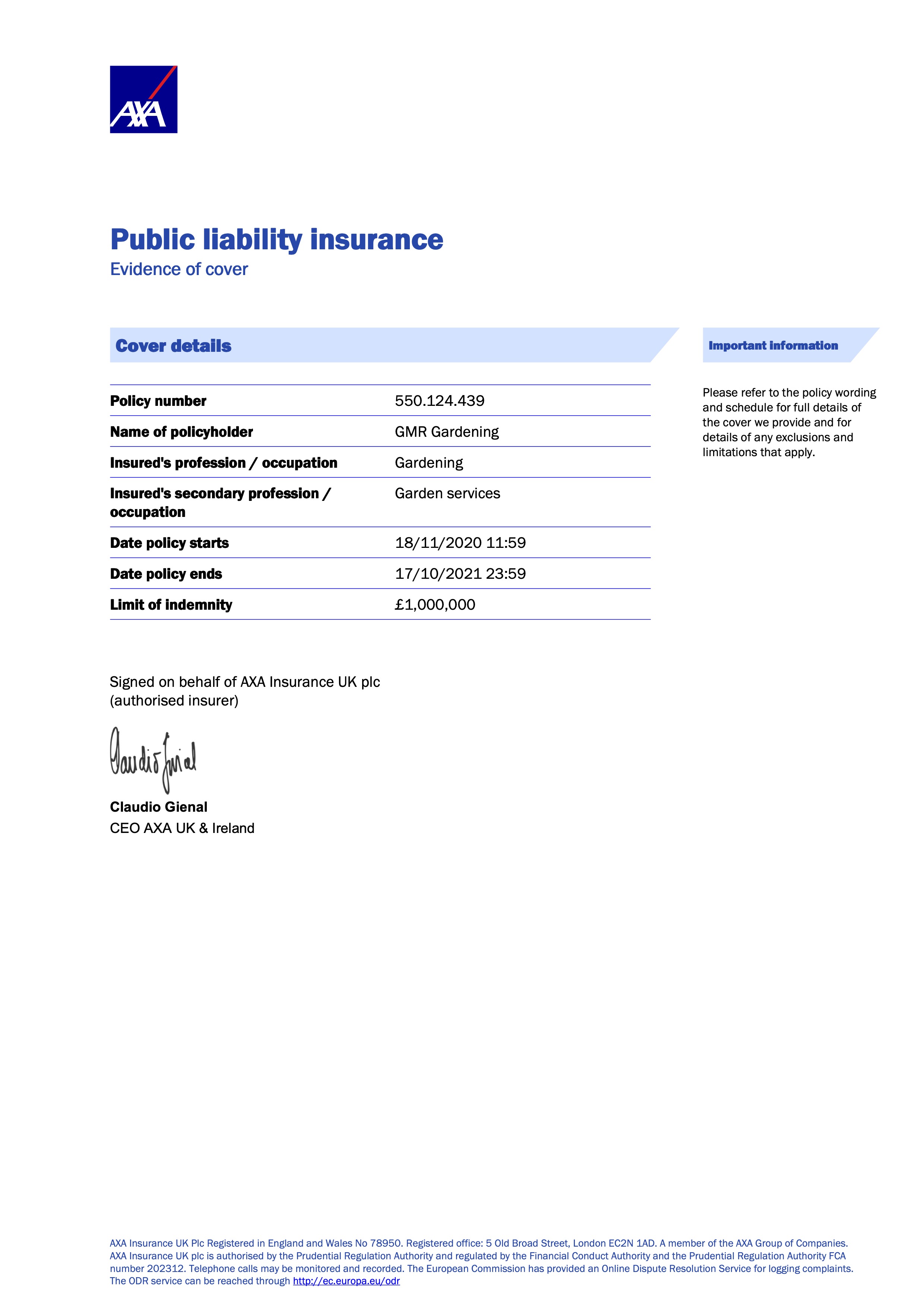 Just in case you are worrying, we are fully insured with Public Liability and Personal Injury/Accident Insurance with AXA Plc. For your peace of mind, up to date evidence of our Public Liability Insurance cover can be found by clicking here.